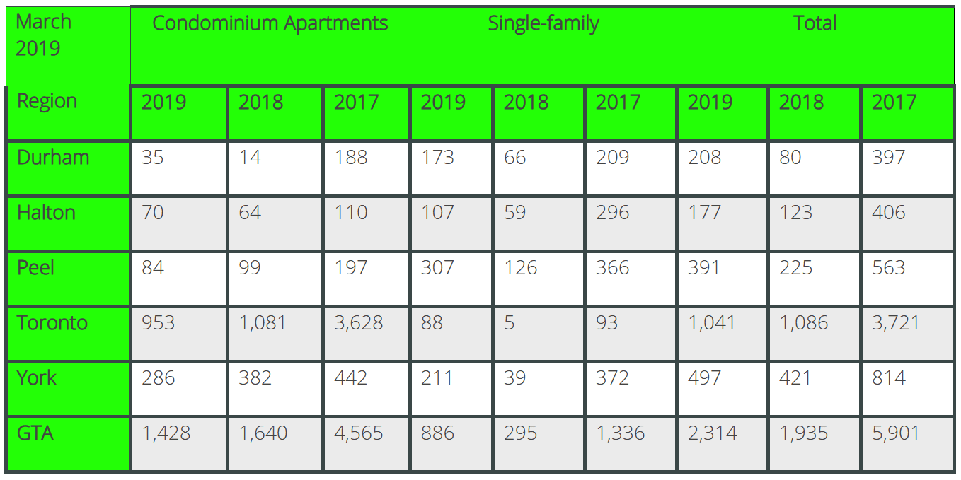 Total new home sales, with 2,314 new homes sold, were up 20 percent from last year, though still 36 percent below the 10-year average, according to Altus Group*, BILD’s official source for new home market intelligence. There were 886 new single-family homes sold in March, including detached, linked, and semi-detached houses and townhouses, up from last March’s low of 295, but still 38 percent below the ten-year average. This is the fifth month in a row that new single-family home sales have increased year-over-year. Sales of new condominium apartments in low, medium, and high-rise buildings, stacked townhouses, and loft units, with 1,428 units sold, were down 13 percent from March 2018 and 34 percent below the ten-year average.